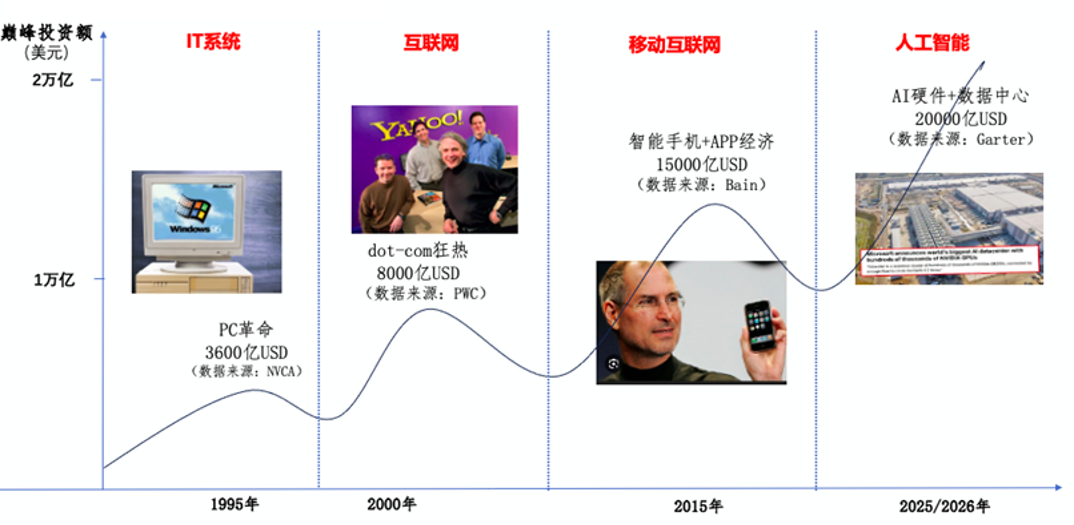 本轮AI大模型技术突破,引发了史上最大规模的投资浪潮。那么,现在对大模型的投资停下来了吗?没有,PC工业革命的时候投了3600亿美元,今天开始投2万亿美元,已经超过当时电信业的整体投资额。多吗?不多,可能还会继续投资加倍。