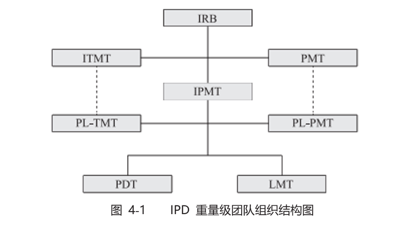 IPD重量级团队组织结构如图 4-1所示,产品线IPMT管理若干 PDT和LMT,IPMT有 PL-PMT和 PL-TMT分别管理产品组合和技术,为IPMT产品投资提供产品和技术建议。公司级的IRB负责产业发展和产品线投资决策,同样有 PMT和 ITMT两个参谋组织。