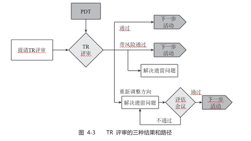 TR评审与 DCP决策不同,它是由 PDT负责的,没有终止项目的权利, 因此 TR评审没有不通过这一选项,只有“通过或带风险通过”与“重新调整方向”两类。在华为,“通过”说明达到技术检查的质量要求,没有问题,可以开始开发流程规定的下一步活动;“带风险通过”说明有遗留问题需要解决,但不影响下一步活动的启动,可以并行进行;“重新调整方向”在这里的含义是有遗留问题必须首先解决,通过评估后才能开始下一步活动,此时才算为 TR点通过时间。遗留问题的改进措施和计划,由PQA跟踪其完成。图4-3为 TR评审的三种结果和路径。
