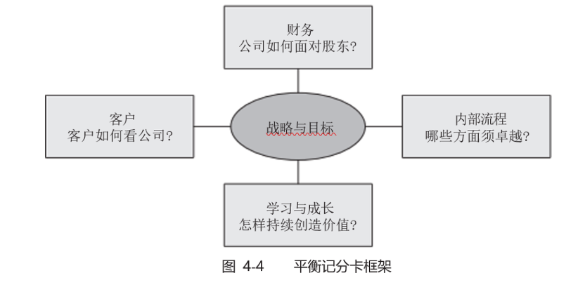 平衡记分卡(BSC,BalancedScoreCard)就是一种将企业战略转化为行动的可操作框架,如图4-4 所示,管理层通过财务、客户、内部流程、学习与成长四个维度相互关联的指标设计,来考察企业和组织的绩效。其中学习与成长指标是企业和重量级团队的持续发展指标。