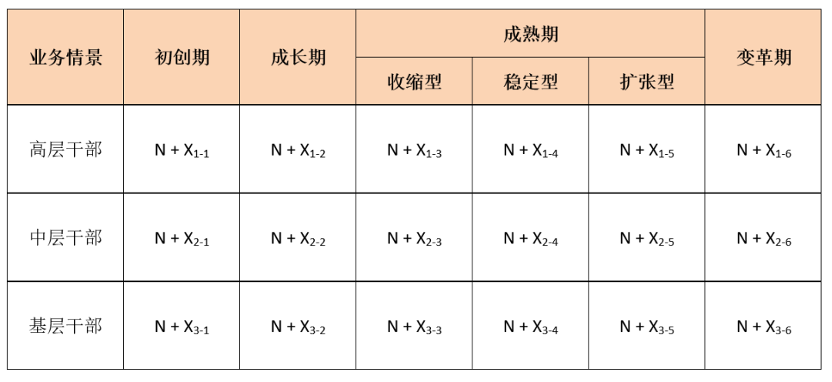 备注:“领导力Xn”是指不同业务情境下不同管理层级干部应具备的情境领导力要素X,不同单元格内X的内容和数量不完全相同。