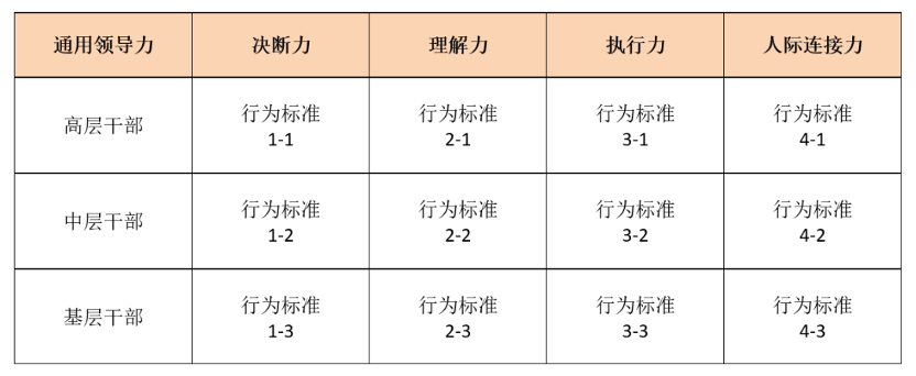 备注:“行为标准N-n”是指N项通用领导力要素对不同管理层级干部的差异化行为要求。