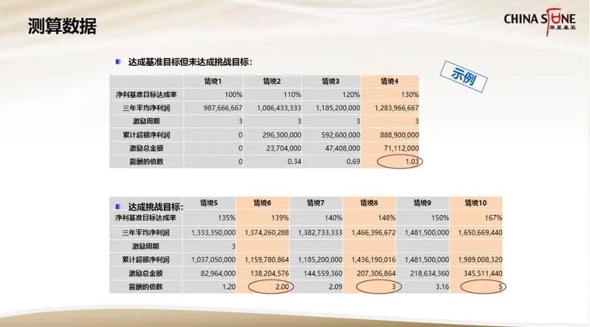 相关测算数据如下:基准目标达成率100%时,无超额净利润,薪酬激励总额为0;基准目标达成率110%时,总激励金额约2300万元,相当于全体激励对象薪酬总额的34%;净利润达成率130%(未超挑战目标)时,激励金额相当于全体激励对象薪酬总额的1.03倍,此阶段均按8%的比例计提激励。