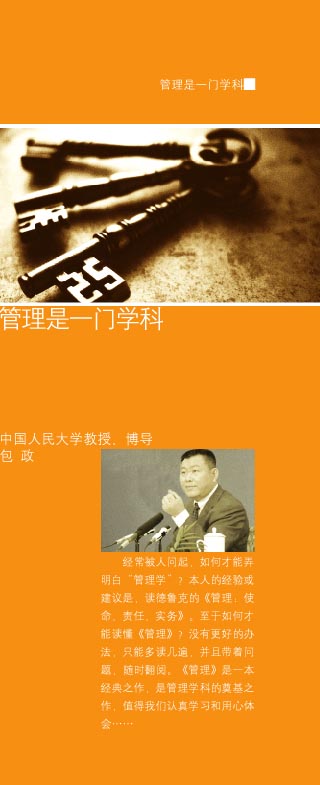 德鲁克撰写《管理》的目的,是要建立一门学科,一门管理学科,一门 “ 经世济民 ” 的学科。德鲁克认为 ,战后的 25 年,一股管理热潮席卷了全球,这是 20 世纪最为重要的一个事件。这个事件意味着 “ 管理 ” 正成为现代组织机构不可或缺的 “ 功能 ” ,成为现代社会的主流意识而伴随我们左右; “ 组织和管理 ” 已经成为我们这个时代最核心的命题。依靠管理的功能,维系组织机体的存在,维系社会的正常运行,这是历史赋予 “ 管理 ” 的一项任务,赋予 “ 管理学 ” 的一项使命。也只有管理、以及管理学科的理论和方法 ,才有可能处理复杂的组织过程,确保现代社会的正常运行。