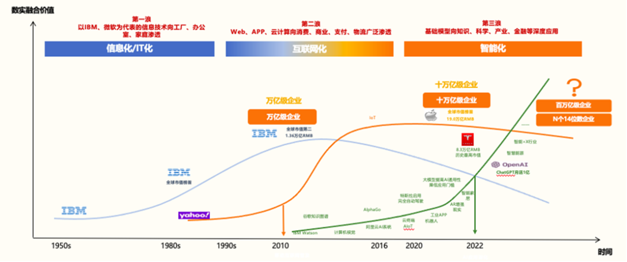 第三浪:2022年—2022年以后,进入第三个浪潮——智能化浪潮。代表性企业如英伟达,市值已过5万亿美元。