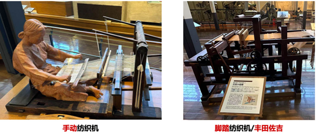 上图是丰田手动纺织机和脚踏纺织机。这是日本最鼎盛的手工业时代的产物。后来丰田纺织从德国买回一台大型的蒸汽机,通过传送带,将动力传递到了纺织生产线上,带动了每一台纺织机,脚踏纺织机被取代了,机器换梭代替了手工换梭,蒸汽机驱动的自动化生产,成为纺织工业革命的主流生产模式。之前穿梭穿得最快的织手工资最高,但到了蒸汽机时代,一个人看可以50台机器,三班倒,电工、自动化的零部件管理人员值钱了,整个就业岗位发生了重新的塑造。
