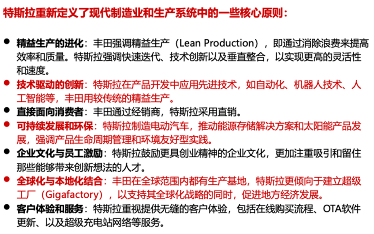 我因为去过丰田,跟丰田的副总裁有过深入的沟通,知道这个提要总结的好与不好。当我们认为它总结的很好的时候,我却认为落后,没跟上时代,没看到什么是特斯拉主义。汽车工业时代的这一页早翻过去了。现在车的价值在于自动辅助驾驶系统,在特斯拉新建的20万张GPU卡的算力中心,当特斯拉通过收集汽车行驶的数据,并用模型跑通自动辅助驾驶系统的时候,在FSD操控下,人们可以把车全放出去,让它自己开。因此,将来的车不会在停车场,它要么是充电中,要么是跑在路上。基于此,整个城市、房地产、停车场会进行重大的重构。那么,以此逻辑为基础,特斯拉能不能做出来10万亿美元的市值?值得我们关注。我认为,这才是真正的特斯拉主义。所以,只研究那辆车,那是“特斯拉汽车主义”,不是生态化的、面向未来的特斯拉主义。