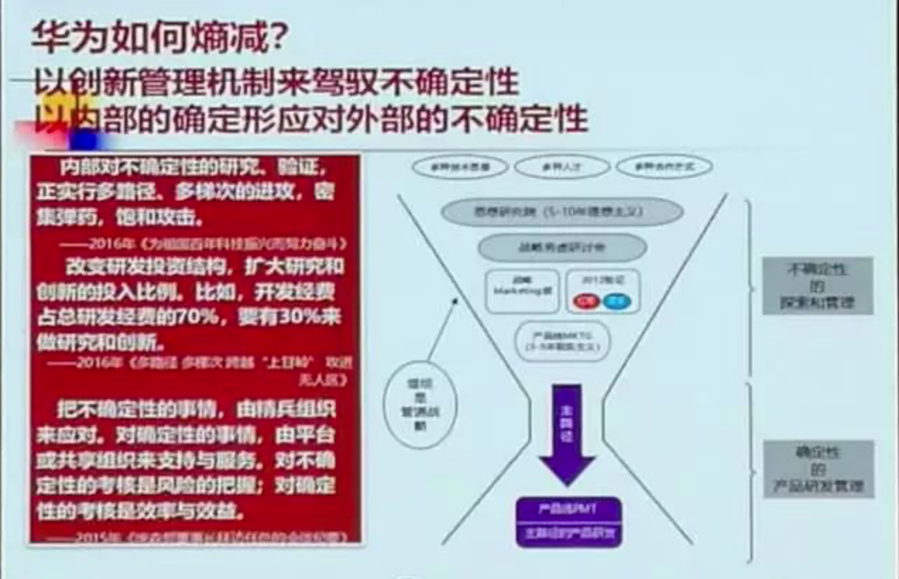 华为的管理机制创新有一个模型,多种思想、多种人才、多种方式,这就是炸开人才的金字塔,一杯咖啡主义。然后通过思想研究院,通过战略务虚研讨会,包括未来技术实践验证,最后形成产品线。这包含两个部分:一个是不确定性的探索和管理,另外一个是确定性的产品研发管理,二者的衔接形成一个漏斗型,方向就大致清晰了。这个机制是开放的,是与外界能量充分交流的。所以,华为为了应对不确定性,2015年正式成立思想研究院,它产生的不是研发成果,产生的是对未来方向的探索,它的作用是吸收外界的新能量。