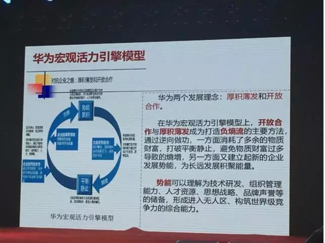这是华为思想研究院提出的华为的活力引擎模型,构建这么一个体系,华为理论上也有一些探索,提出了一个利用开放性、远离定律、非线性来构建一个公司的活力模型。这个模型还包括宏观引擎模型,有两个关键点:一个厚积薄发,另一个是开放合作。厚积薄发就是要积累能量,就是滴水穿石。滴水穿石关键是聚焦,其次是坚持。
