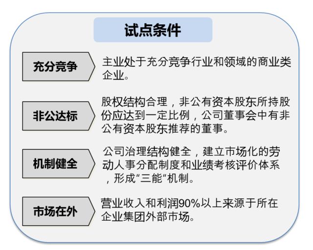 到目前为止,混改企业员工持股还处于试点阶段,拟开展的企业需要提出试点申请报批。试点条件如下图所示: