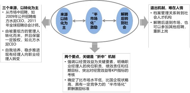 中国建材职业经理人制度的核心是把握“两个核心”,即身份市场化和管理契约化;做到“三个关键点”,一是经理人来源以重组方转化为主,而不是自己培养、公开招聘为主;二是实施“半市场化”薪酬,而不是完全市场化或现有薪酬不变;三是不胜任的一退到底,而不是制定什么过渡方案。