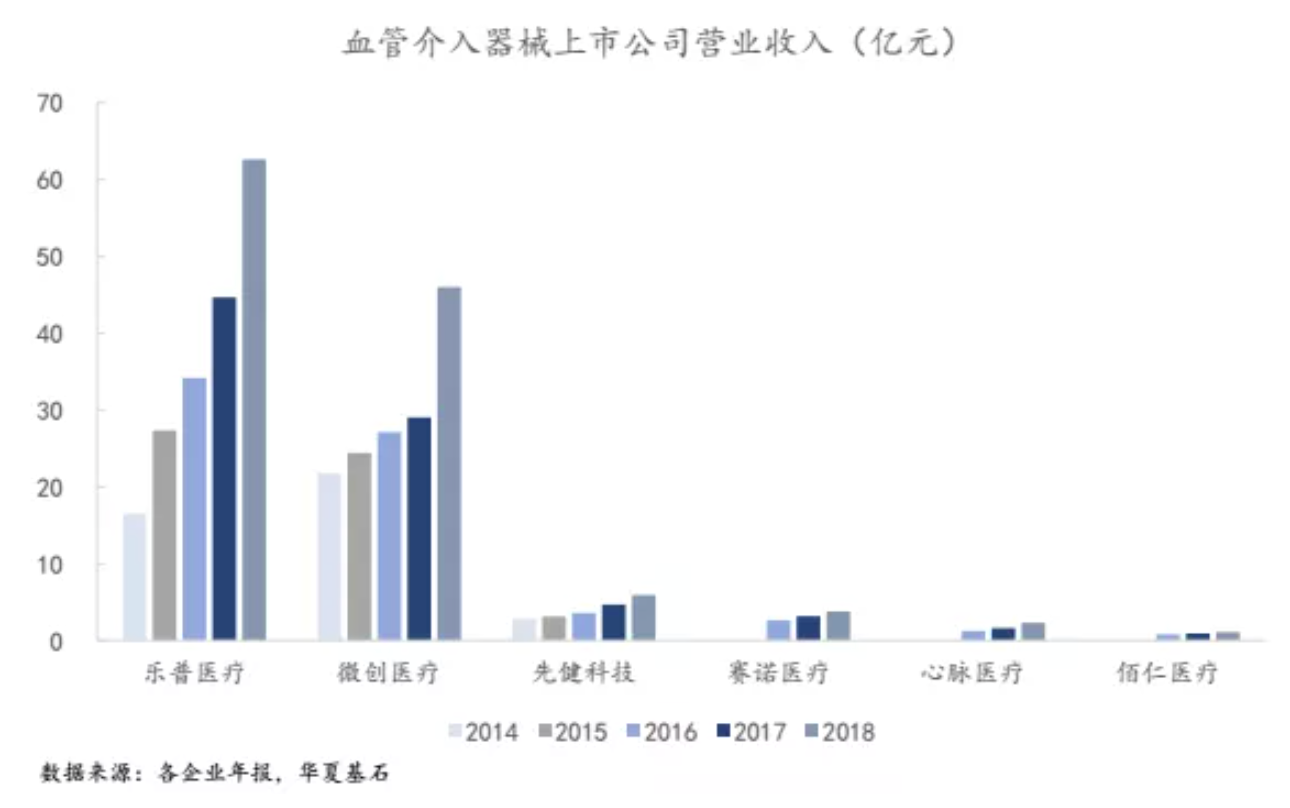 乐普医疗在血管介入耗材上市公司中营业收入最高,2018年营收达到62.6亿元,微创医疗达46亿元。其他创业型公司营收规模较小。先健科技、乐普、心脉医疗和微创医疗近年营收增速持续加快,2018年营收增速都超30%。