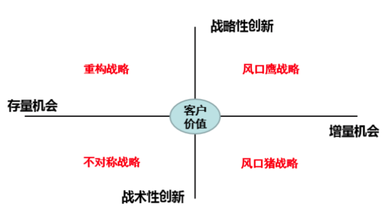 以机会和创新为坐标,划分了四大象限,其实这四大象限代表了四种不同的增长形态,即“风口猪战略、不对称战略、重构战略、风口鹰战略”。