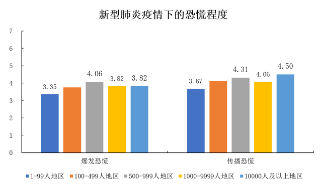 根据各地截至2020年2月10日24时新型肺炎确诊人数,我们对全国34个省市、自治区、直辖市和特别行政区重新进行了疫情地区划分,并针对来自全部5个疫情地区(确诊1-99人地区、100-499人地区、500-999人地区、1000-9999人地区、10000人及以上地区)的被调查对象有关疫情的恐慌程度进行了分析。