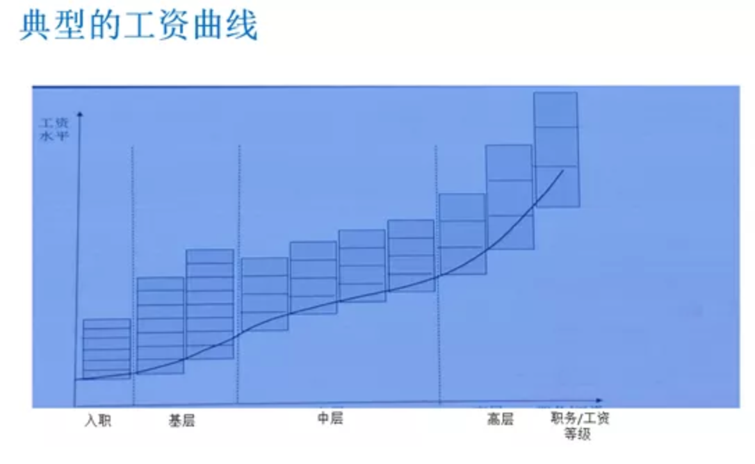 在华为,薪酬的概念包括工资、奖金、福利、津贴、股权和分红等,是个很宽的概念。另有待遇,属于公司费用,不在薪酬之中。观察华为的薪酬特点,我认为上图是很典型的工资曲线,虽然我没有数据直接支持这个曲线。
