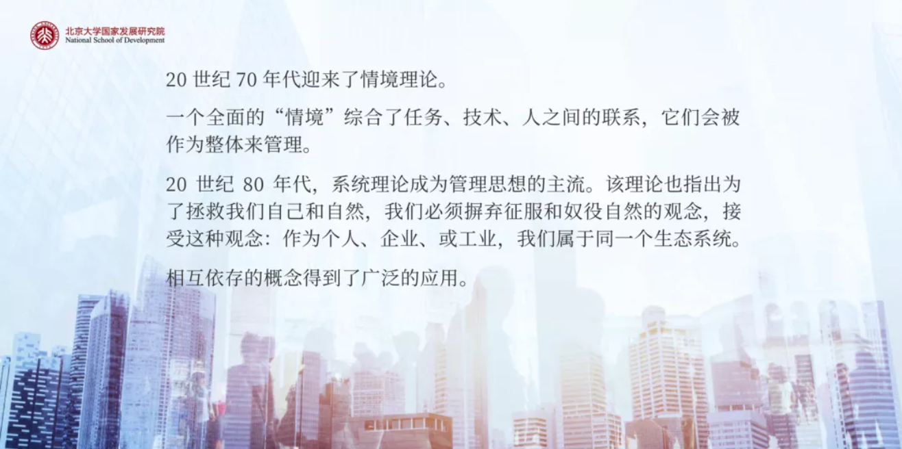 20世纪40年代,管理学考虑的是上下级关系如何改善,从而改变效率;1950年代,管理讨论更多的是管理者的功能和角色;1960年代,研究的兴趣从个人转到组织。20世纪70年代迎来了情境理论,即人和组织放在不同的情景当中产生的结果不同,不能再孤独地去看个体、技术和环境,应该把它们放在一个整体的情景当中,作为一个整体来进行管理。20世纪80年代开始,系统论成为管理思想的主流,出现了生态系统以及延续到今天被广泛应用的很多管理概念。