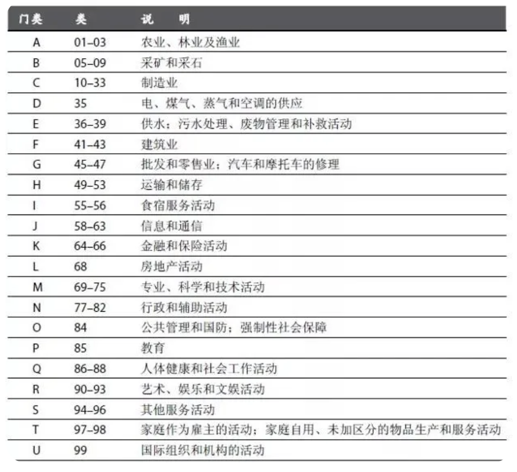 下图为《国际标准行业分类》中第二部分第一章总体结构中将单个类别归并,成为以下21个门类: