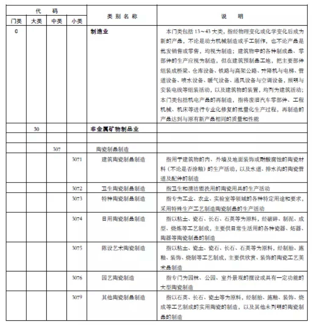 下表中节选了中国国标分类表中的部分条目,例如大类30为非金属矿物制品业,其中类307为陶瓷制品制造,第四级小类分类3071到3079为陶瓷制品下属的子类。从小类3071到3076分为为:建筑陶瓷制品制造,卫生陶瓷制品制造;特种陶瓷制品制造;日用陶瓷制品制造;陈设艺术陶瓷制造。不容易归类的统一划到小类3079其他陶瓷制品。