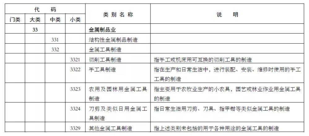 再比如二级分类(大类)中33是金属制品业,其下面的三级分类(种类)332金属工具制造中,3321切削工具制造就已经是该分类目录中第四级的最终分类了。然而,对于业内的从业者来说,这个分类实在是太粗糙了。