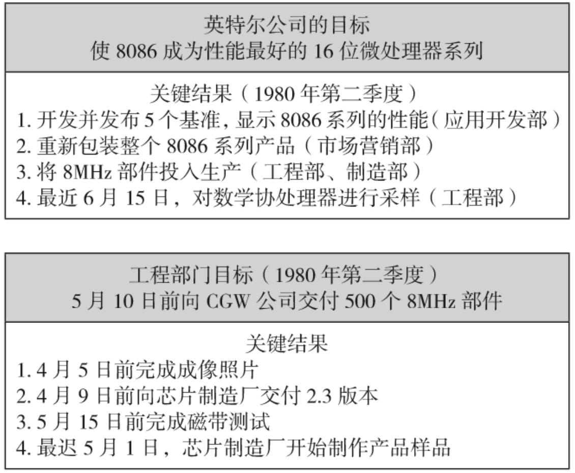 OKR方法强调目标应该是重要的、具体的、具有行动导向并且能鼓舞人心的。如果设计合理并且实施得当,目标能够有效地防止思维和执行过程中出现模糊不清的情况。关键结果是检查和监控如何达到目标的标准。有效的关键结果应该是具体的、有时限的且具有挑战性的,但又必须是能够实现的。最重要的是,它必须是可度量的、可验证的。如果没有一个具体数字可以度量这些结果,那么它就不能算是一个关键结果。下图给出了当年英特尔公司的8086微处理器与摩托罗拉公司的68000微处理器展开激烈竞争时的OKR的例子。