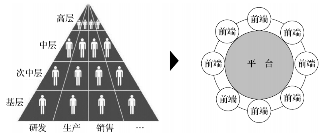 “大平台+小前端”的组织结构同时决定了平台和前端之间不再是领导与被领导的上下级关系,而是基于平台各主体的职责划分和价值定位共同服务用户的协同合作关系:前端基于对用户需求的敏锐洞察,分析用户行为,把握需求方向;后台则通过迅速配置资源,提供标准化服务及智能化信息数据赋能前端,使其快速响应需求,提升用户体验。平台内部不再有层级之分,前端完成客户交互和任务交付,平台支持、帮助前端,每个个体的核心目标都是满足用户需求,创造用户价值,每个个体都是价值创造活动中的一个节点。传统组织高高在上的决策权被充分下放,众多小前端在获得参与权、自治权和决策权的同时,其能量潜力被进一步激活和触发,不仅实现了它们的自组织、自适应和自成长,更获得了充分施展才华、发挥创新创造能力的机会和平台。