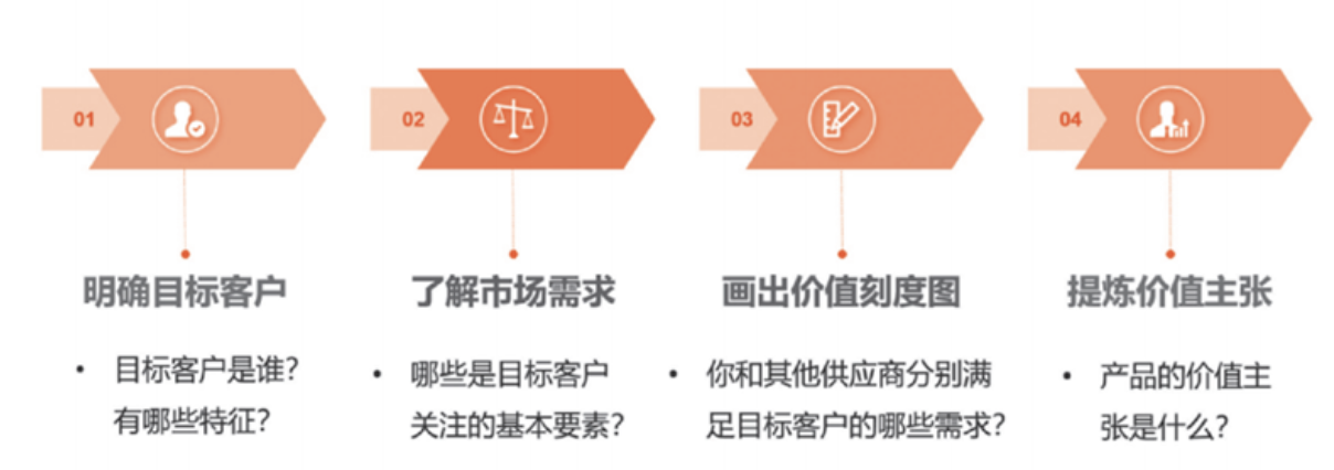 明策略的关键,是清晰界定目标客户和价值主张,其过程可分为四步:明确目标客户,了解市场需求,画出价值刻度图,提炼价值主张。