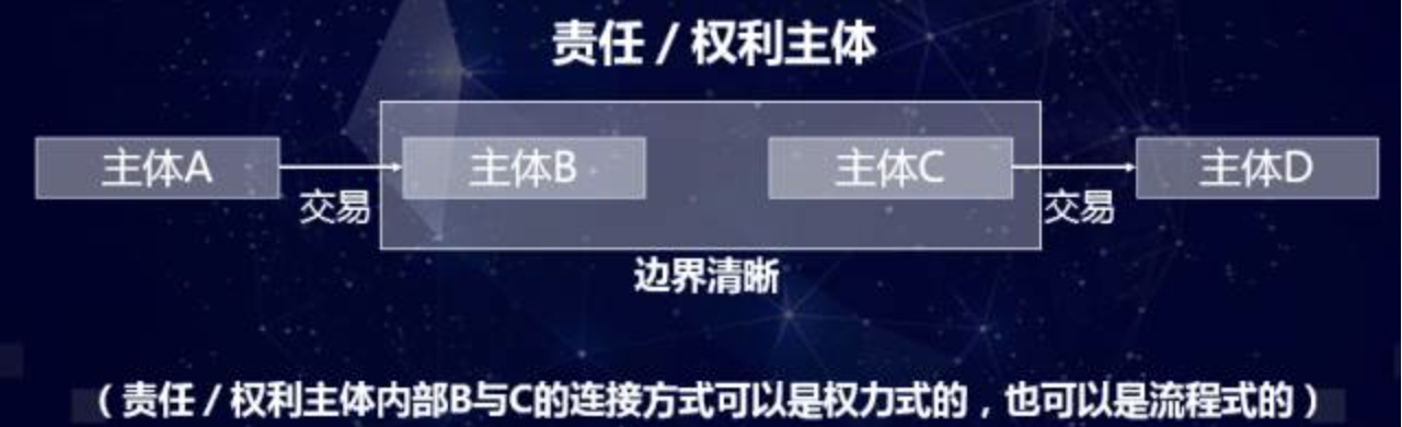 下面我们再看机制连接,如图4所示。我们可以把B和C两个主体封闭起来,不管它们之间怎么连接,从而形成一个大的责任清晰的主体(部门/机构)。比如把采购和制造封闭起来,变成一个制造总部。制造总部可以设计为一个利润中心,那就和其它主体(部门/机构)形成交易关系。所以机制连接的本质是横向的交易关系。当然,单一主体(A或D)也可以成为交易主体。机制连接将运用于外部的市场方式内部化了。通过交易化的机制连接,组织打开了边界;同时也使通过市场配置资源和通过内部组织配置资源这两种方式结合在一起了。