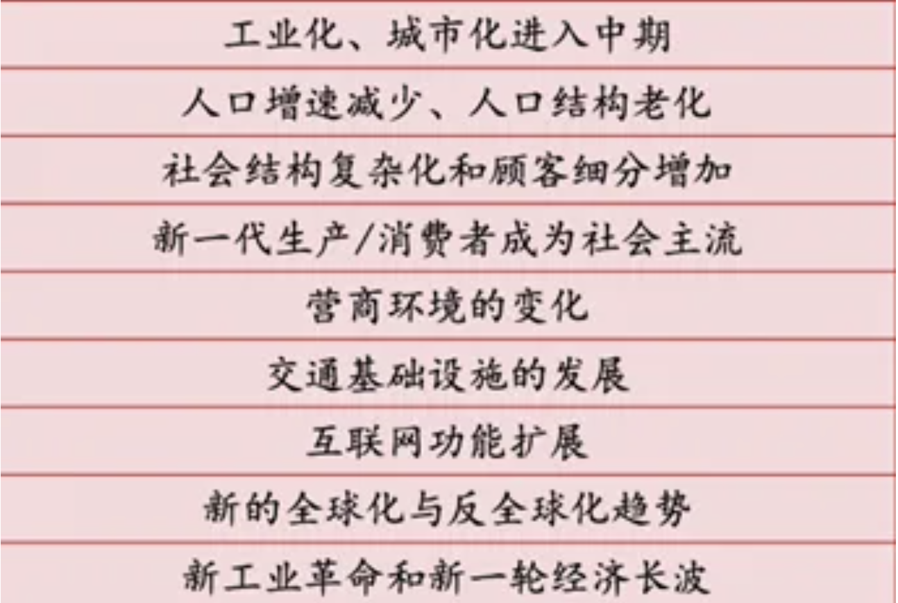 (4)市场扁平和需求弥散。很多企业在管理市场的时候,把市场分成一级市场、二级市场、三四级市场,甚至五级、六级市场,已经划分到村一级了。这说明市场是立体的,大城市市场和乡村市场差异较大。但随着城市化推进,市场将会逐渐变平。也就是大中城市和乡村之间的差异会变小。这样的话一些需求就会弥散,需求的范围会扩散至次级市场。
