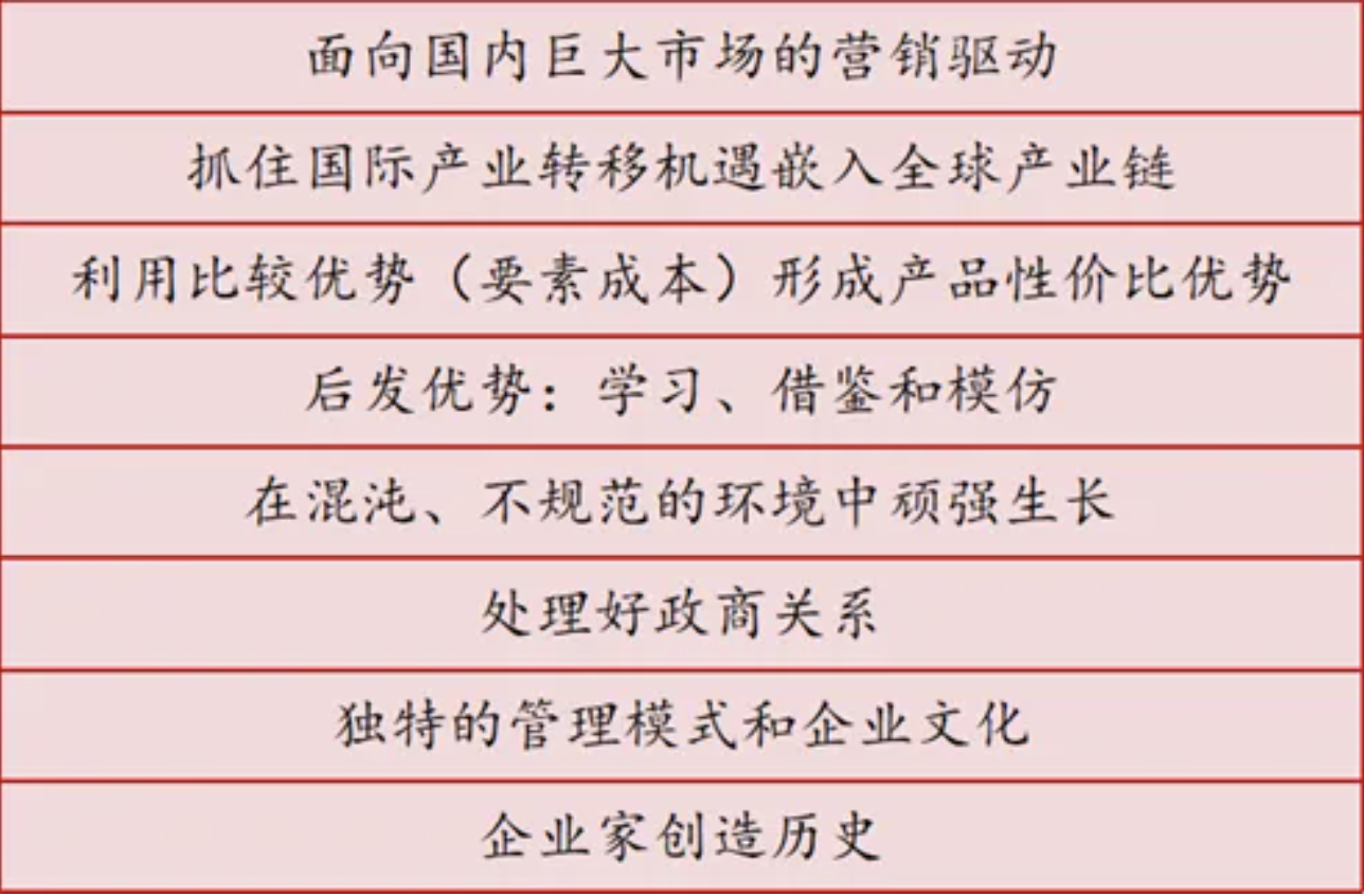 (1)营销驱动。面向规模巨大、快速增长的国内市场的营销驱动。许多民营企业在起步时,没有多少技术基础,往往是通过营销创新、营销变革、营销组织来实现第一曲线的成长。(2)国际产业转移机遇。一些民营企业抓住了国际产业转移的机遇,尤其是中国加入WTO之后的机遇,切入了全球的产业链。一方面是为全球的消费者提供一些相对低附加值的消费品,另外一方面为一些国际品牌以及企业的价值链提供配套的中间产品,以及提供OEM、ODM等服务。(3)比较优势。所有国际、国内市场上取得成功的企业,实际上都是利用了生产要素的比较优势,尤其是人力资源成本优势,形成了产品的性价比竞争力。在中国制造业发展的第一阶段,中国产品大部分是以低价面目出现的。(4)后发优势。由于我们是赶超型的经济,大部分企业是在比较低的起点上起步的。前面有标杆,我们可以学习、借鉴,我们可以模仿,总的来说学习成本较低。(5)顽强生命力。中国的市场经济本身是一个动态变化和发展的过程,有很多新事物新问题出现,这是我们过去从来没有面对过的。所以整体环境显现出一些混沌、不确定、不规范。在这样的环境中,中国民营企业的成长,必然会遭遇一些周期性、非周期性因素的影响,但是其中一大批适应了这种环境,顽强生长起来了。(6)政商关系。中国经济发展离不开政府的作用。处理好政商关系是中国民营企业成长的重要因素。(7)企业文化和管理模式。中国民营企业经过几十年的发展,一些企业形成了相对独特的管理模式和企业文化,包括大家经常对标的华为。它的管理是中西合璧的,有自己的特色。还有一些民营企业,从传统文化中吸取营养,显得独树一帜。(8)民营企业家。我们不得不说,就民营企业的成长而言,是企业家创造了历史。中国民营企业家群体——他们大都是创业英雄,对于中国经济增长起了巨大的推动作用。