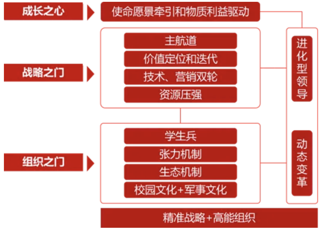 首先要有成长之心,既要有物质利益的驱动,更要有使命愿景的牵引。然后打开战略之门。核心在于选择主航道,要有价值优势定位,实现价值迭代;要有技术、营销双能驱动,资源要压强。从组织之门来说,要以学生兵模式在内部形成有张力、有竞争性、有力量的组织机制;要形成一种生态型的组织平台,让万物生长,让业务和人才得到发展。从文化上来说,就是校园文化+军事文化。从领导力来说,要形成一种优化生态的进化型领导,不断进行动态变革,概括起来就是8个字:精准战略+高能组织。