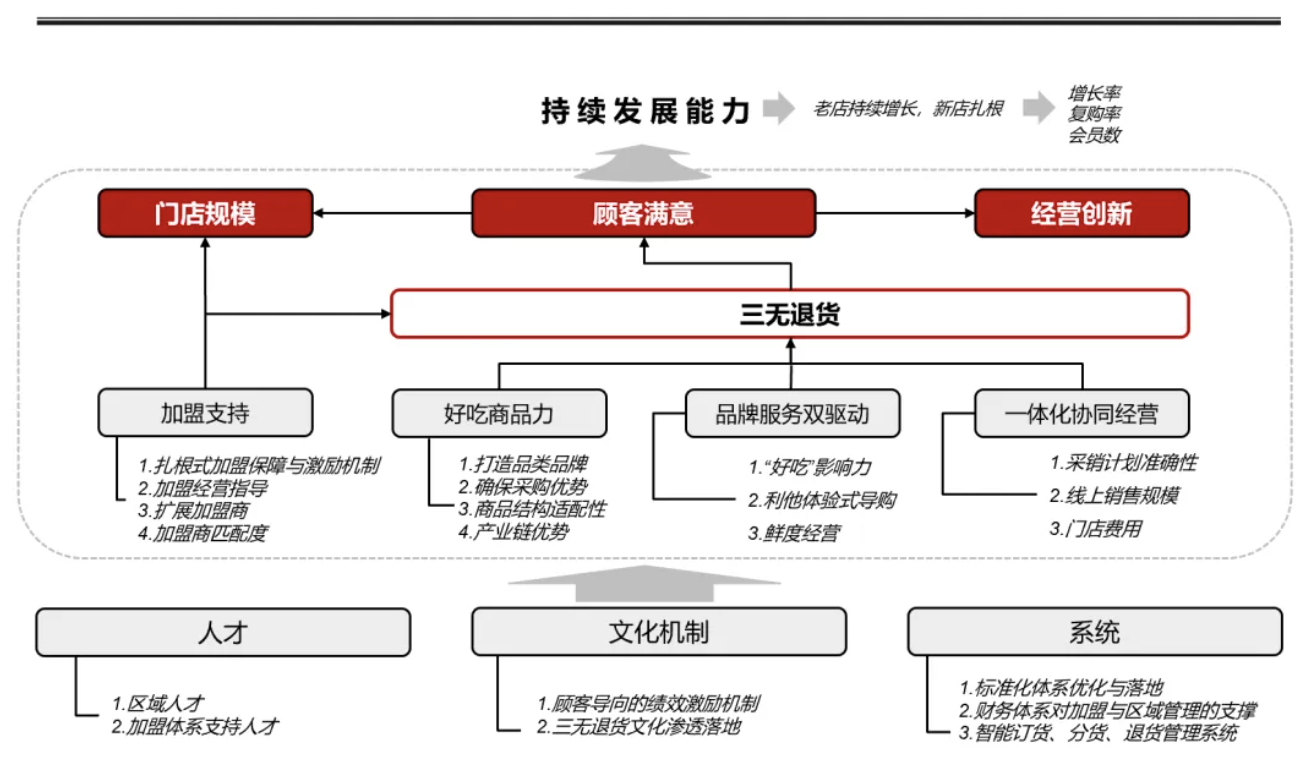 单店盈利能力确实是一个核心,因为从创业之初,他们就决心扩张,目标是在全国开设3万家门店。当然,迄今为止,百果园的门店也才开到6千多家,距离所设立的目标还有一定的距离。为什么要强调单店盈利能力?在过去,一个加盟商估计要开上三年多才能收回成本,但现在估计一年多就可以了。这就是单店盈利能力提升带来的显著效果。所以,他们最初准备把这一指标当成核心战略目标来对待。但是他们的老板认为这不太对,他认为,应该把“三无退货”放在核心位置。所谓“三无退货”,即消费者可以无理由、无小票、无实物地办理退货,甚至可以在线上操作退货。并且他强调,这一条必须放在比“当年盈利”更加核心的位置。
