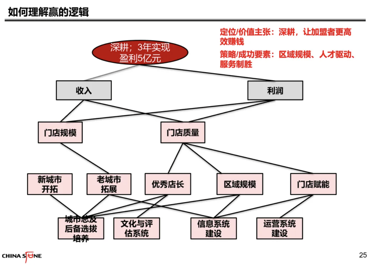 我当时确实不太理解。后来,经过深入地沟通,我了解了他的想法。是什么呢?他认为,如果企业只强调单店盈利能力,下面的区域和门店就会变形,发生比如以次充好,或者只卖高毛利产品的情况。这样的话,单店的盈利就不可持续。基于这样的观点,我们达成了共识,并且重新绘制了战略解码图。