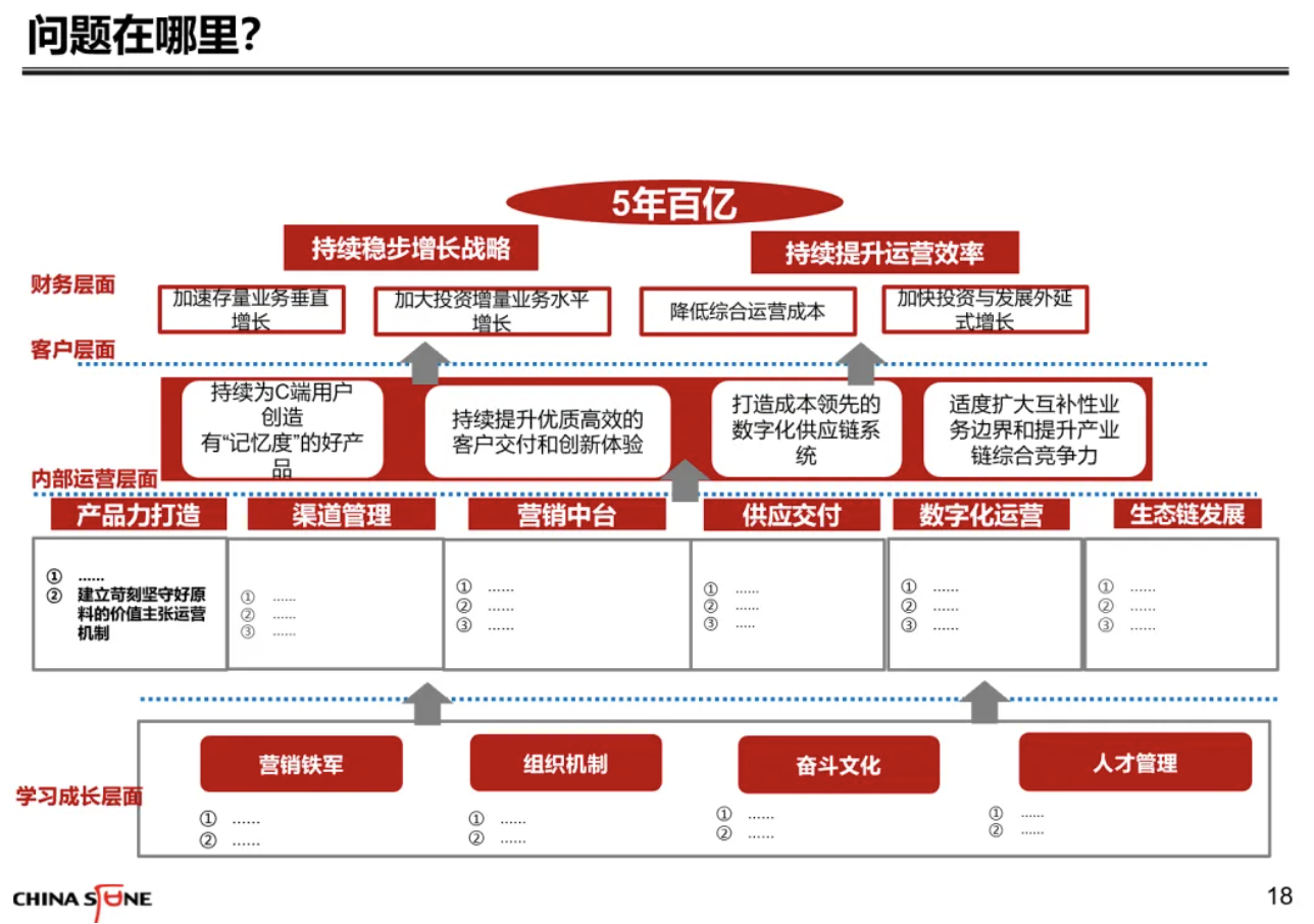 仍然以上面这个客户为例。当你提出了5个亿的核心目标,但所有的目标客户都是一些朝不保夕的小企业,你团队所有的动作都是在围绕如何凑齐这5个亿来展开,和我们追求持续打胜仗,最大化地争取战略性客户,争取帮助这类客户提升市占率,哪一个目标更加正确?这就是我们说的,定义目标的能力决定了业务能力,而业务能力也决定了他会定义什么样的目标。