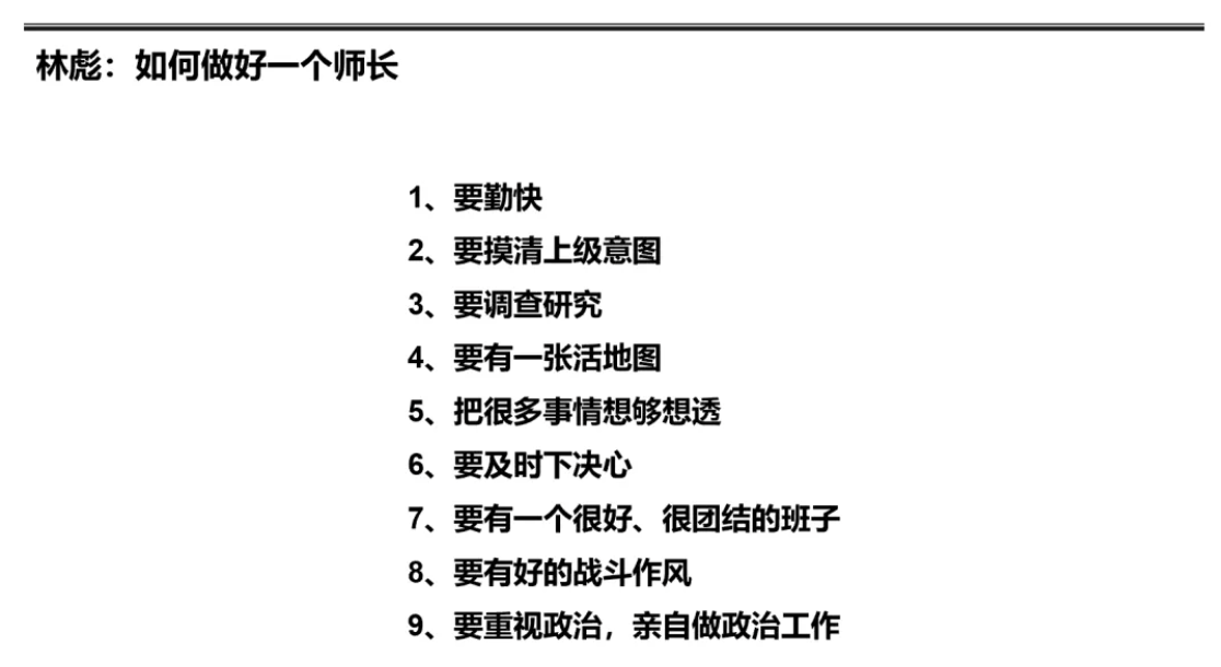 不妨再来看一看林彪是如何做好一个师长的。相对华为对干部标准的表述,林彪的设计更加具象: