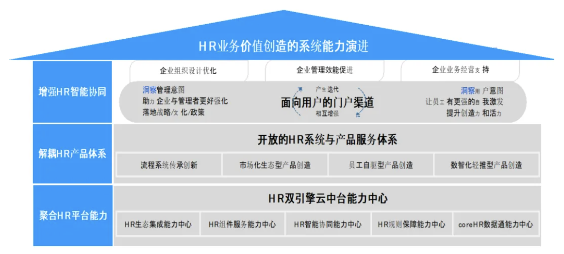 以上分享的一些产品创新的小例子,也是探索HR数字化的部分尝试。我写过一本书叫《HR+数字化》,这本书的核心目的就是希望讲清楚我们HR的应用系统,应该基于用户、基于对象解耦开,要把原来纯流程性的系统解耦开,按照场景化解耦开,让HR的系统适配多用户场景。同时,解耦开形成一个一个积木之后,又能够通过中台对这些积木进行中台上面的组合,还能够通过前端的门户侧,实现协同的组合。用架构师的思维赋能HR新发展方向,这个是我希望在这个课题研究里面反复探讨的话题,简单来讲可以分成以下几层,最上层是智能协同的平台,这个平台就是刚才讲到的门户,这个门户不是一个简单的让你看、让你用的地方,它是可以互动的地方,这种互动体现出对管理意图的洞察,对用户意图的洞察;接下来是产品体系,这些产品体系有管控驱动的产品、有组织与员工驱动的产品、还有开放的可插拔的云产品,它们嫁接到统一的HR中台体系上,完成公共组件的共享以及数据逻辑的互通。