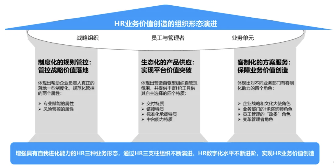 三支柱的转型过程,也是HR探索高质量发展的过程,我认为HR高质量发展在HR自身组织形态上的具体体现,就应该是:管控战略价值落地、保障业务价值创造、实现平台价值突破。