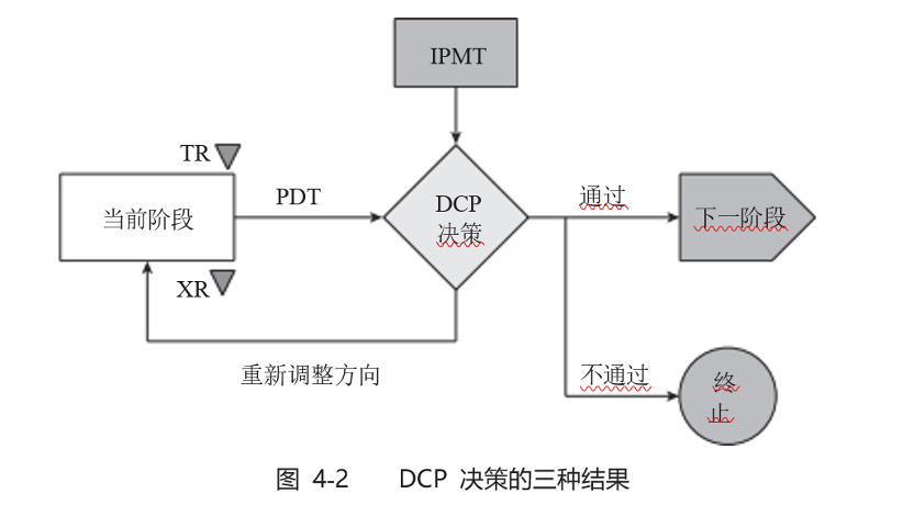 DCP决策有三种结果:一是通过,进入下一个阶段,批准PDT下一个阶段或到下一个DCP的计划并提供要求的资源;二是不通过,项目终止,总结项目的经验教训和文件归档关闭,释放资源;三是重新调整方向,需要PDT 按照决策要求的方向重新开展相关工作或收集更多的信息重新再来决策。图4-2为DCP决策的三种结果和路径。