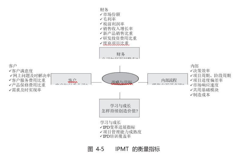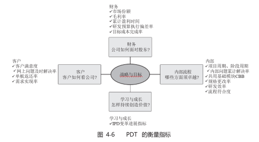 其中流程符合度和 IPD变革进展指标就是按 BSC设计增加的内部流程和学习与成长的指标,以便PDT团队既关注短期项目目标的达成,也关注长期能力提升,摆脱产品成功对 PDT经理等个人的依赖。