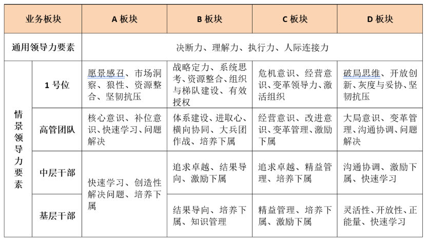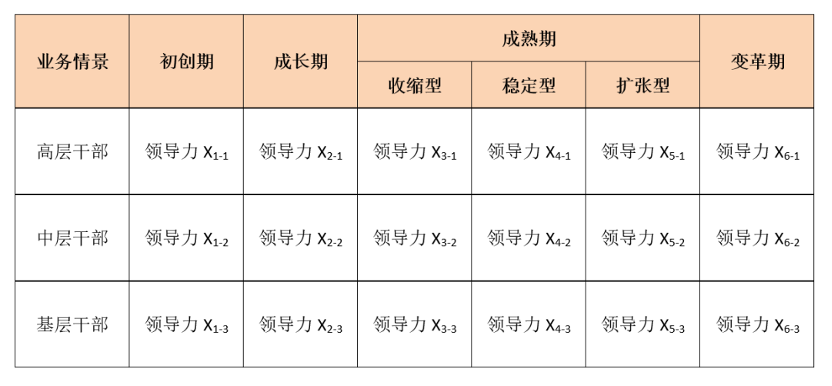 备注:“领导力Xn”是指不同业务情境下不同管理层级干部应具备的情境领导力要素X,不同单元格内X的内容和数量不完全相同。