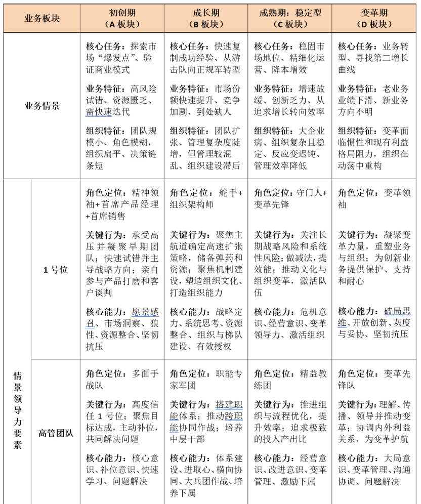 对于具体的企业而言,业务发展阶段和业务发展策略是影响干部领导力要求的主要情景因素。业务发展阶段不同,干部的领导力要求不同,比如“初创期”需要企业家具有非常强的“愿景感召、市场洞察、狼性、资源整合和韧性抗压”等能力,而“成长期”则需要企业家具有“战略定力、系统思考、资源整合、组织建设和有效授权”等能力。同一发展阶段,不同业务发展策略的领导力要求也有所不同,比如同样是“成熟期”的业务,打“顺风局”还是打“逆风局”,要“守成,收割利润”还是要“继续做大,抢对手市场”,对干部领导力的要求都是截然不同的。