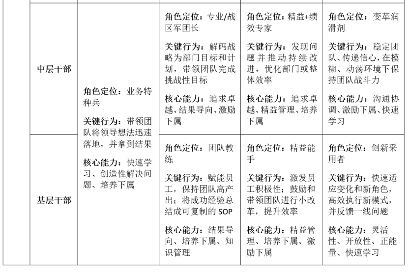 即使企业在业务适配的基础上开发出领导力模型,也会存在模型“一刀切”的问题,即一套领导力模型适用于所有干部,而不论其类型或层级。这忽略了干部面临的任务情景的差异,比如不同管理层级的干部其角色定位、核心任务和所需面对的挑战都截然不同,领导力重心和所需能力也应是不同的。“一刀切”的领导力模型让企业难以精准选拔干部,也会造成干部培养资源的错配和低效。