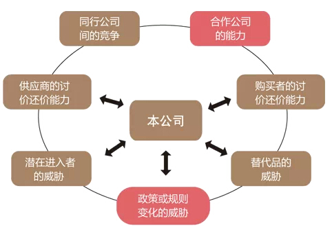 在此我发展了波特的五力模型。我在中国的一些企业中试验过五力模型,我认为不太适用。原因之一是中国很多企业的较大风险来自于政府政策,由于政策的不稳定或突然变化,如利息下调、股市上市公司名额增加、房地产调控政策变化、税收政策变化等,会突然出现危险或机会,它们可能置企业于死地,也可能为企业带来意想不到的好处。比如2008年美国金融危机后,中国很多企业都恐慌,想着如何度过严冬,但4万亿元投资以来,竟然使经济转向了阶段性过热。之二是合作者因素。企业之间不仅与竞争,还有合作。合作力量已成为企业竞争力的核心组成部分。以往单个企业之间的竞争正在变为企业价值链之间的竞争,变为企业群和企业联盟之间的竞争,因此,企业群内的企业数量及其合作性质是影响企业竞争力的一个重要的新因素。这两个因素在中国是至关重要的,因此我们不得不把波特的五力模型增加“政策或规则变化的威胁”和“合作公司的能力”两个力,修订为七力模型(如图2)。