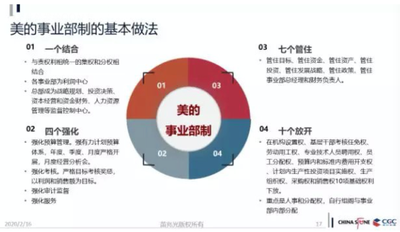 四个强化:权力分下去了,总部的角色是做投资规划、做资本运营、做人力资源体系等。事业部是利润中心,全责承担产品的经营。分权的前提是四个强化。