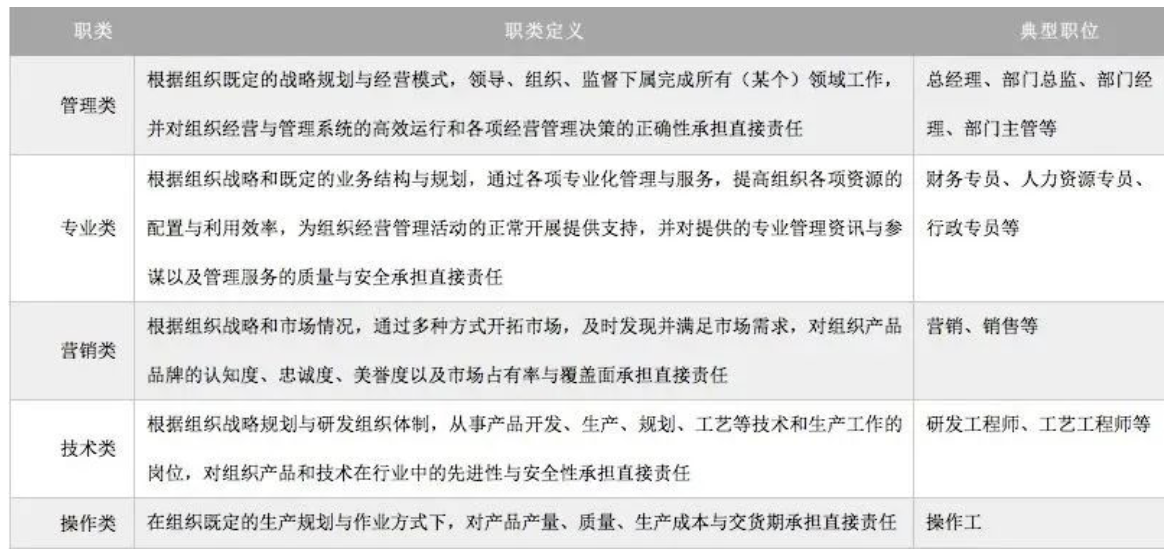 第一步,根据企业业务领域和能力结构,确定职类的划分。以华为为例,华为在构建任职资格体系的过程中,对自身的业务领域和能力结构进行充分的论证与思考,划分了5大职类,分别是:管理类、营销类、专业类、技术类和操作类,并对每一个职类进行定义,如下表所示,以明确各职位的最终职类归属。