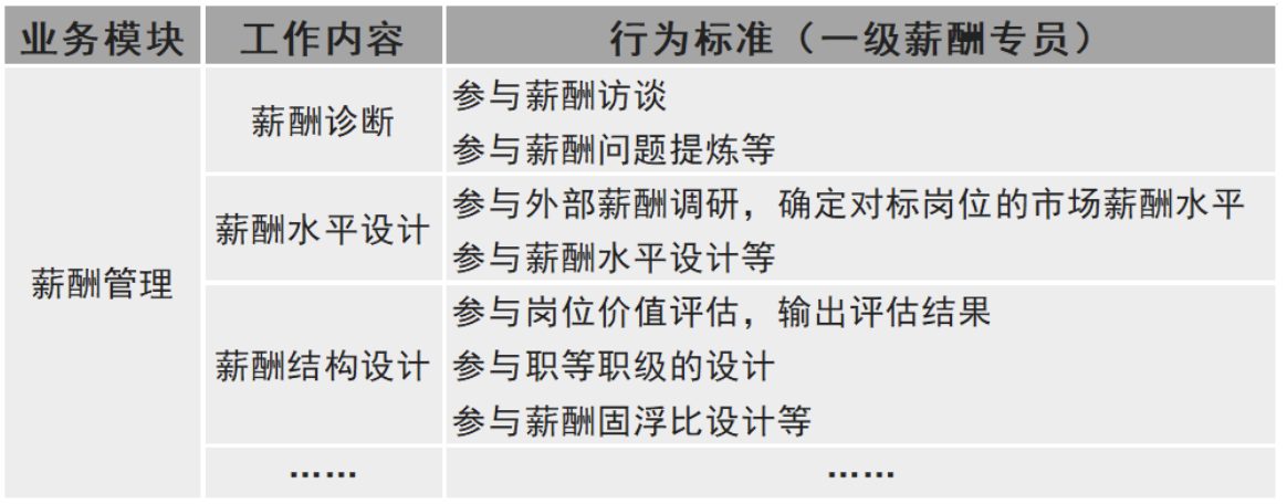 业务模块和工作内容划分清晰后,需要结合不同级别的角色定位,明确不同级别在该工作内容中所参与的程度和承担的责任,并丰富形成行为标准。
