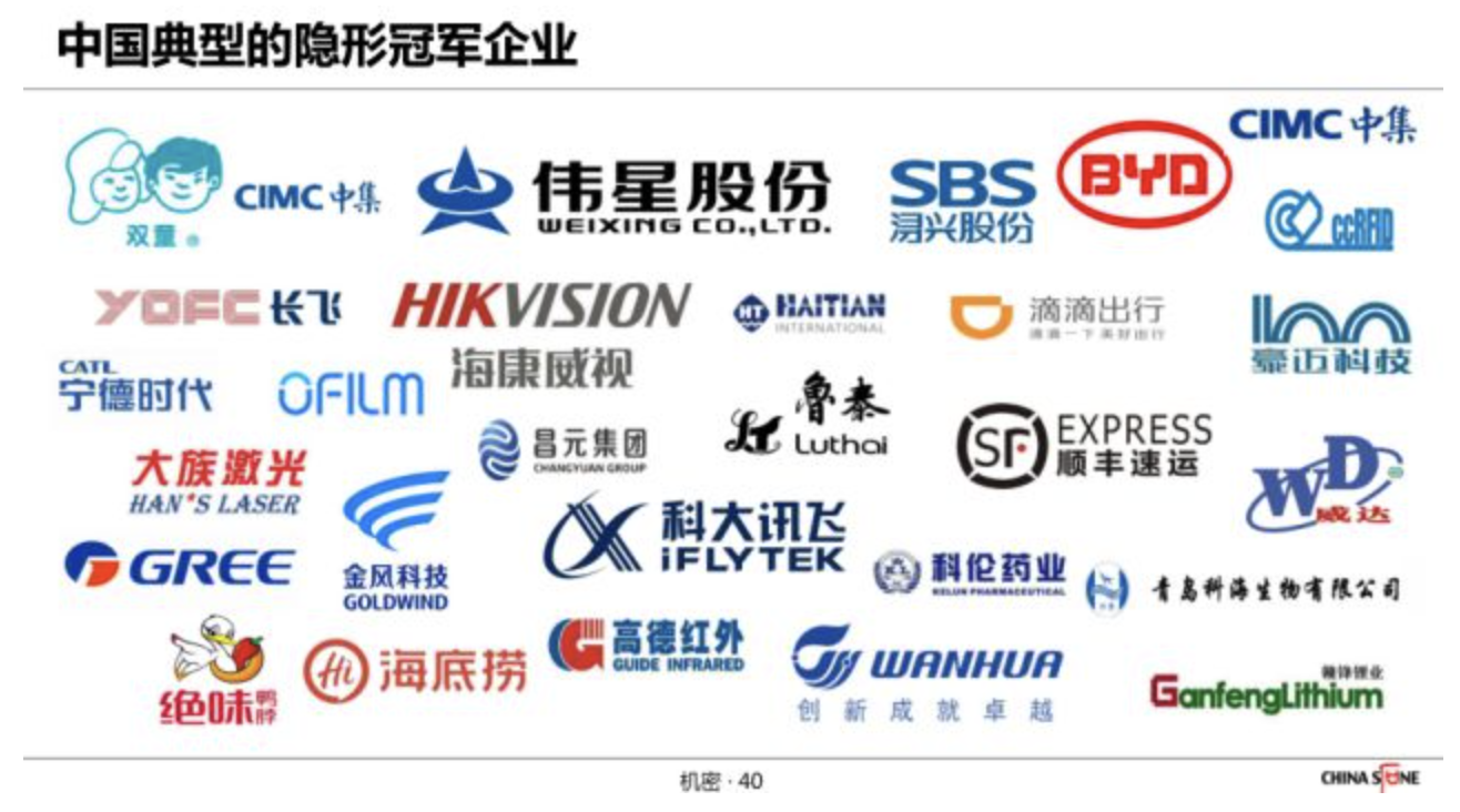 在中国隐形冠军企业的提法之前,工信部每年会评选单项冠军,目的是为培育制造业全球单项冠军,提升企业专业化能力和水平,突破制造业关键领域短板,推动产业整体迈向全球价值链中高端,促进我国制造业高质量发展。其实,在中国企业的语境下,有时候不一定用“隐形”这个词,我们所说的隐形冠军实际上就是细分行业的领袖,属于闷声发财的企业,不被大多数人所知道;但同时也专注于特定的领域,品牌影响度很大。